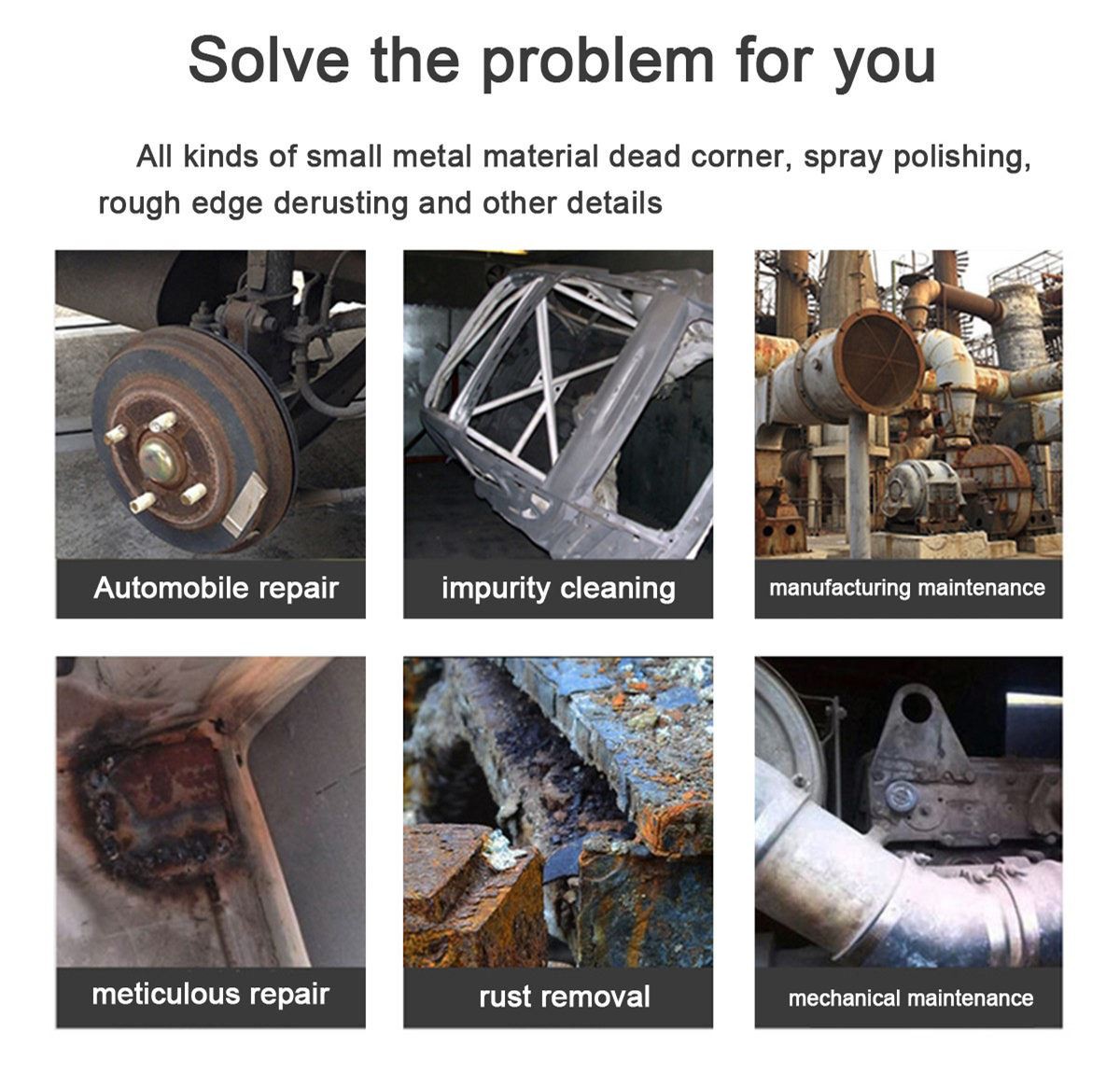 ● Omistettu kaikenlaisille kevyille ja pienille metallikulmille, ruiskukiillotukseen, primäärireunoihin, ruosteenpoistoyksityiskohtien pinnoittamiseen.