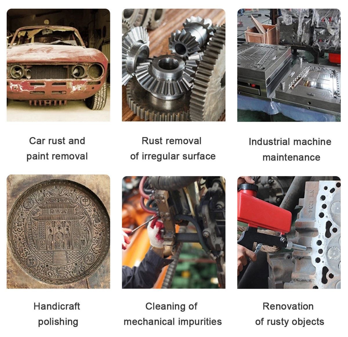 ▶Näitä hiekkapuhalluspistooleja käytetään laajalti laitteistojen, raudan, metallin, teräksen, muottien jne. pintapuhdistukseen tai kunnostukseen. Käytä ruskeaa korundia ja valkoista korundia.